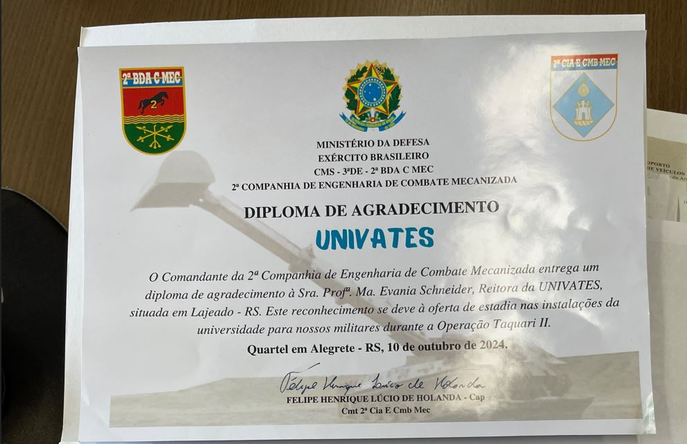 A reitora da Universidade do Vale do Taquari - Univates, professora Evania Schneider, recebeu uma homenagem do 10º Batalhão Logístico – Batalhão Marquês de Alegrete pelo apoio oferecido pela Instituição durante a Operação Taquari II. O reconhecimento veio após o batalhão, responsável por parte das operações de assistência e resgate, ser acolhido no campus de Lajeado durante a mobilização que aconteceu em maio de 2024.