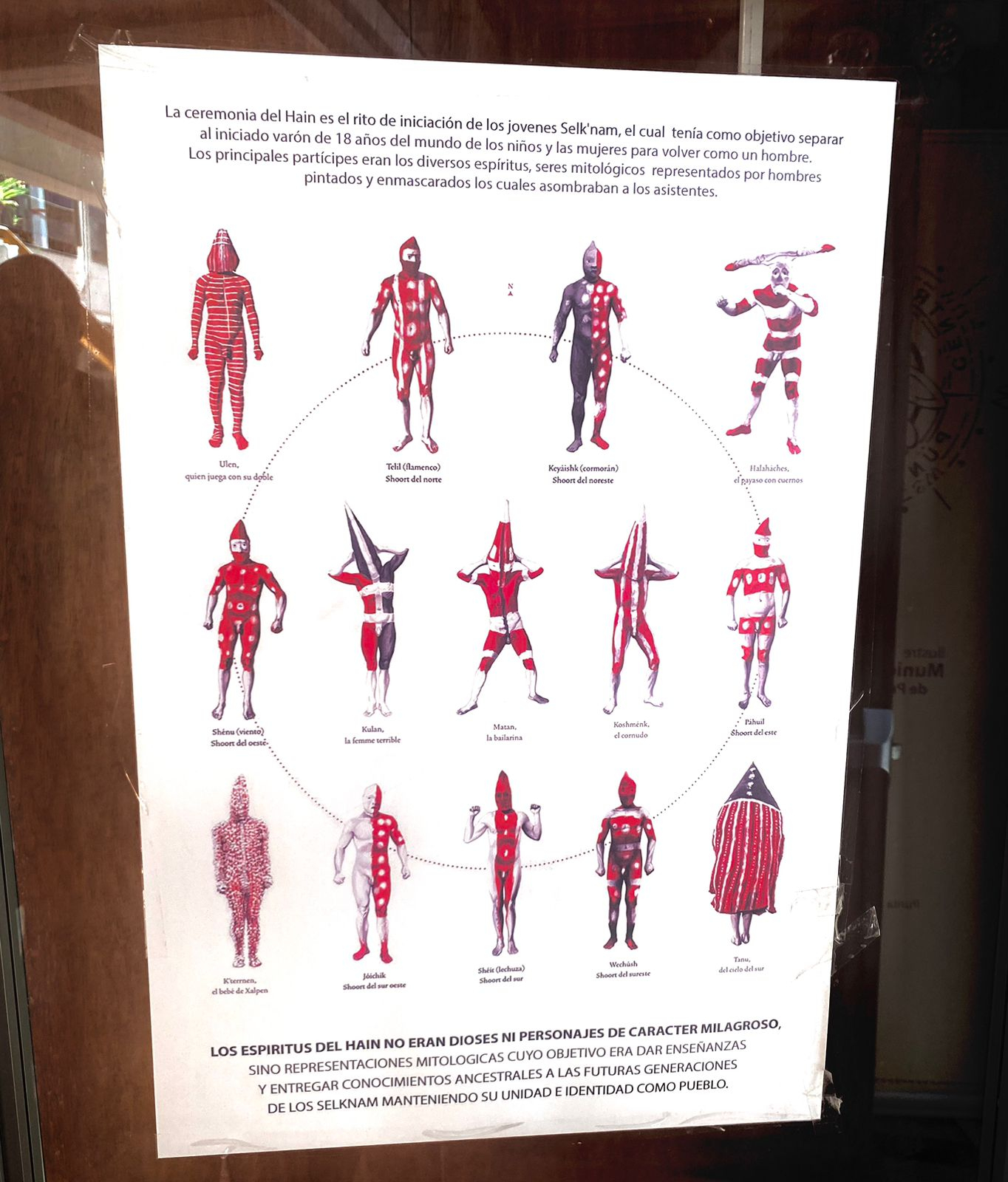 O povo Shelk'nam, indígenas nômades da Patagônia, habitavam principalmente a região ao norte do Estreito de Magalhães, em áreas da atual Terra do Fogo, na Argentina e no Chile. Conhecidos por sua cultura distinta e modos de vida adaptados às duras condições climáticas da região, os Shelk'nam viviam da caça e pesca, utilizando técnicas de caça à grande fauna local, como guanacos e ñandús, além de pesca nos rios e mares. Me chamou a atenção a presença cultural e a influencia desse povo em Punta Arenas, principalmente nas artes. Por um breve passeio no mercado publico pude notar diversos desenhos, esculturas, joias representando principalmente personagens culturais que representam os Espiritus de Hain.