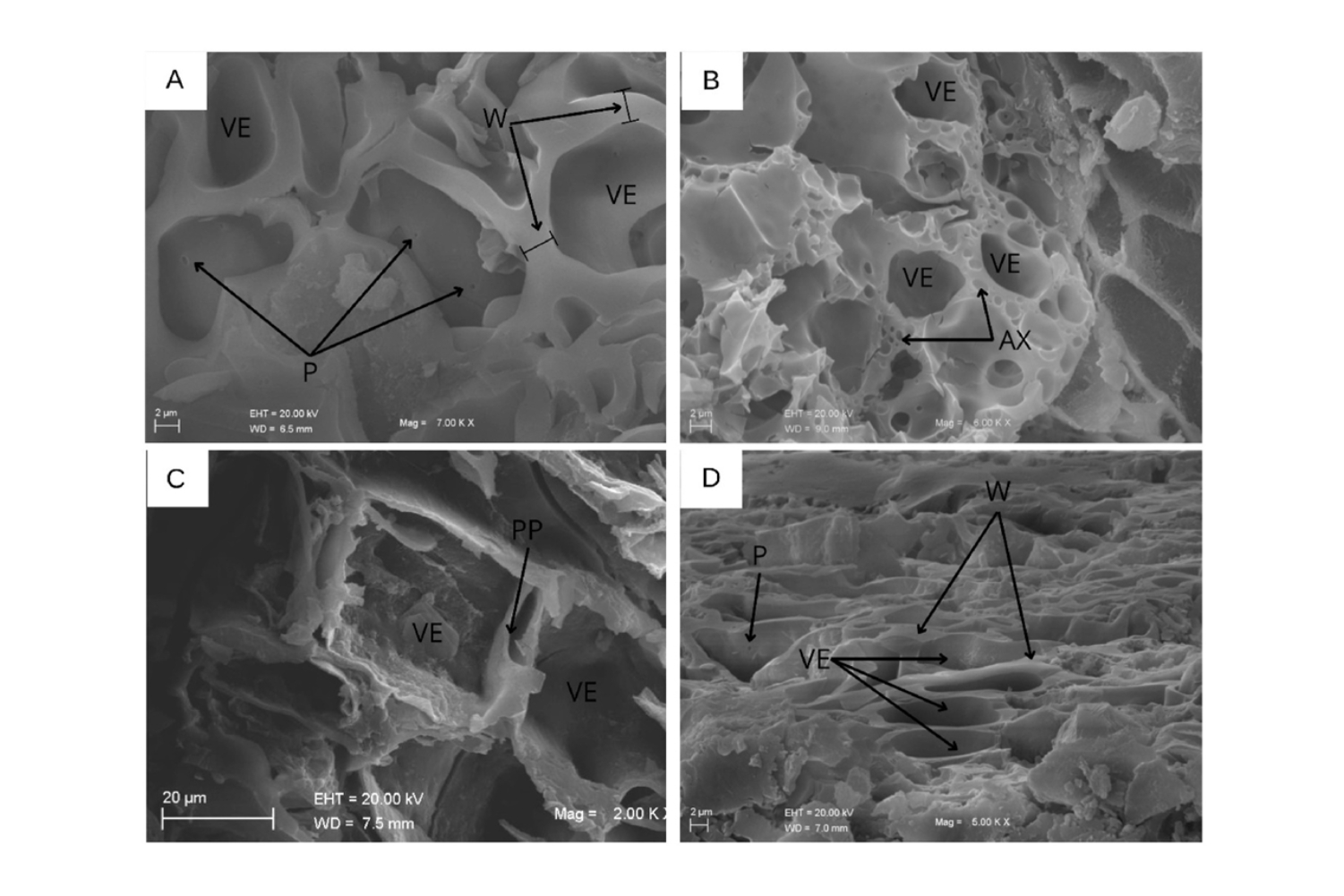 Na imagem abaixo: UFT – 1476. Micrografias eletrônicas de varredura da amostra 01. A - corte transversal mostrando paredes celulares homogeneizadas (W), elementos de vasos (VE) e cavidades (P); B – secção transversal com parênquima axial (AX) e elementos de vaso (VE); C – secção radial com elementos de vaso (VE) e placa de perfuração simples (PP); D – secção transversal com paredes celulares homogeneizadas (W), elementos vasculares (VE) e cavidades (P).