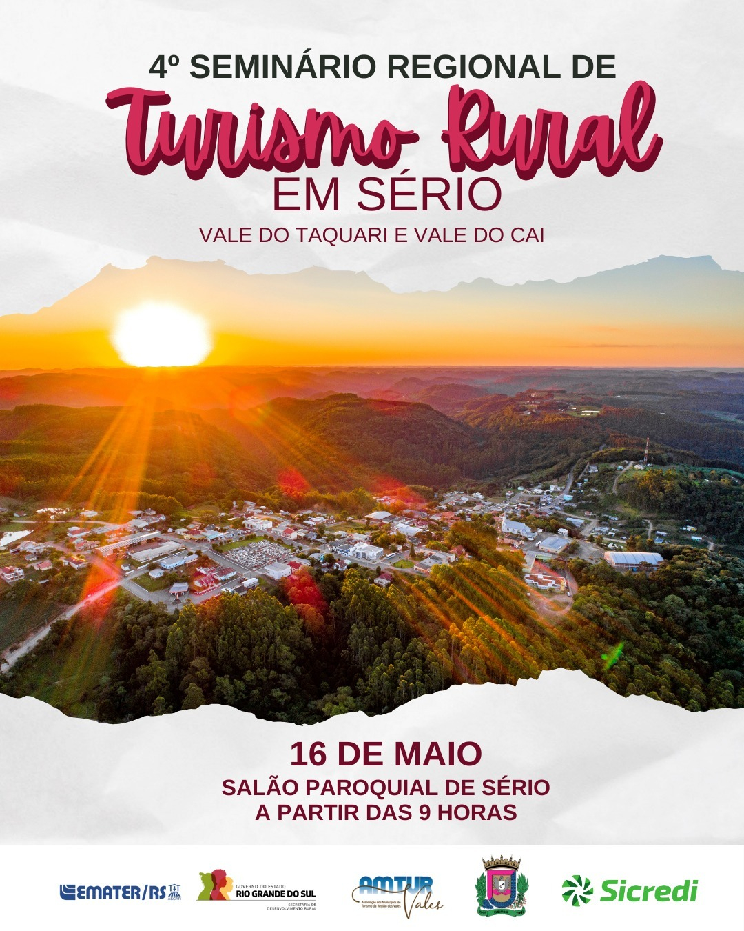 Realizado no Salão Paroquial de Sério, com atividades que se estenderam até a tarde, o seminário foi promovido pela Emater/RS-Ascar, Associação dos Municípios de Turismo do Vale do Taquari - Amturvales e Prefeitura de Sério, com apoio da Secretaria Estadual de Turismo (Setur/RS) e patrocínio do Sicredi. A programação incluiu palestras, exposição de produtos da agricultura familiar, atrações culturais e visita técnica à Gruta Nossa Senhora da Boa Viagem.