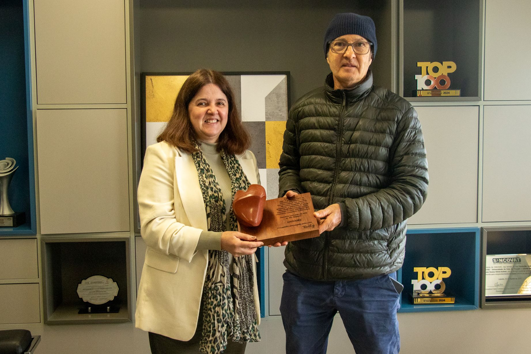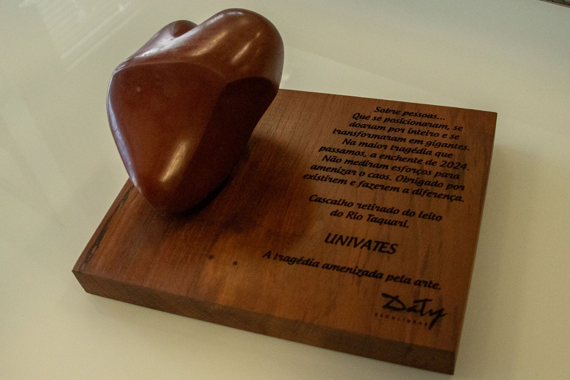 O artista plástico Marcos Datsch presenteou a comunidade acadêmica da Universidade do Vale do Taquari - Univates com uma escultura em reconhecimento à atuação durante o período das inundações de 2024. A obra foi entregue nesta quarta-feira, 13, à reitora da Instituição, Evania Schneider.