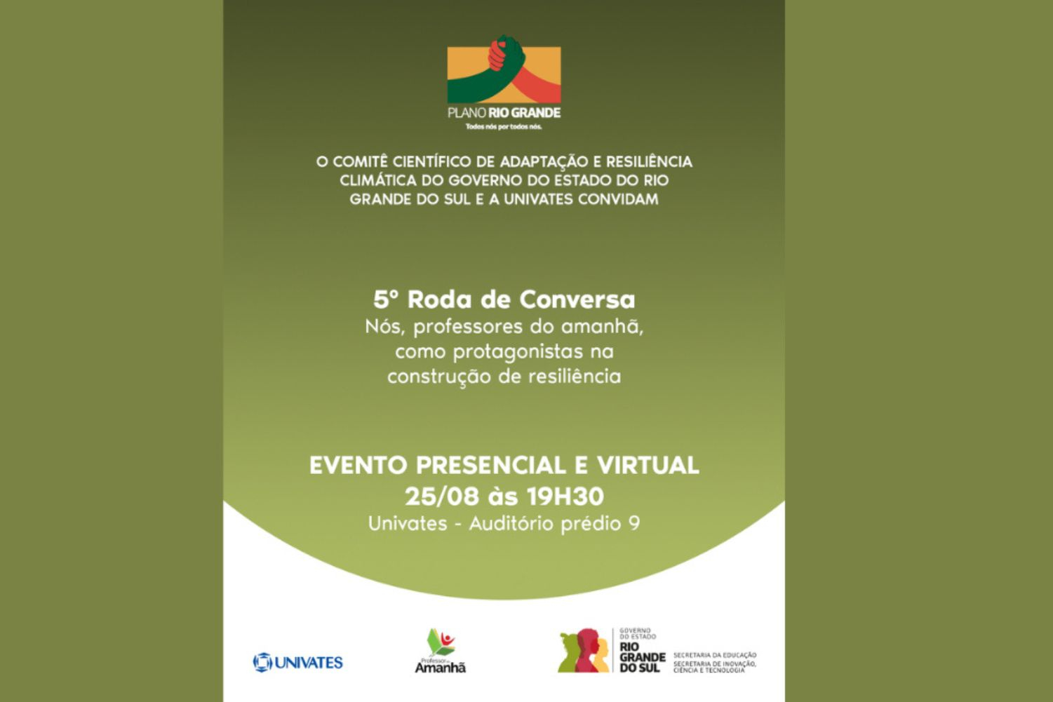A roda de conversa, que ocorrerá no Auditório do Prédio 09, é organizada pelo Comitê Científico de Adaptação e Resiliência Climática do Governo do Estado do Rio Grande do Sul, vinculado à Sict, e pelo curso de Letras da Univates.