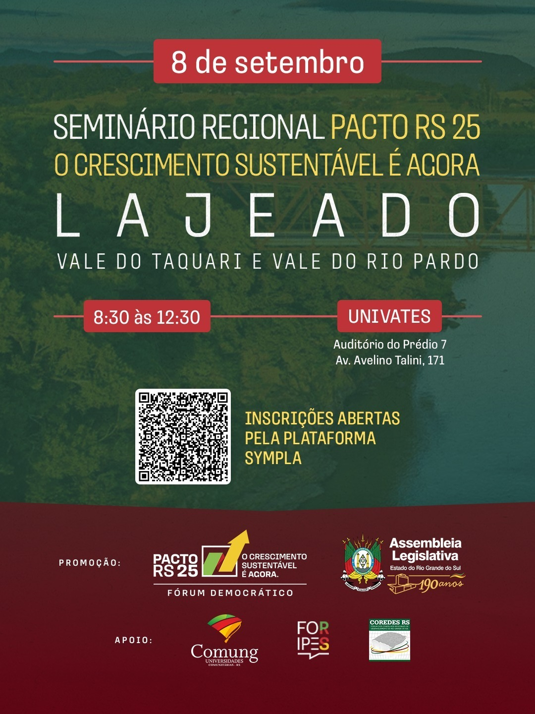 Já no dia 11 de setembro, será realizada a Assembleia Ampliada da Consulta Popular, a partir das 13h30min, no Auditório do Prédio 11 da Univates. O encontro definirá os projetos que irão compor a cédula de votação do Vale do Taquari, dentro do orçamento estadual de 2026. Nesta edição, a região terá acesso a R$ 2 milhões para investimentos em iniciativas escolhidas pela comunidade.