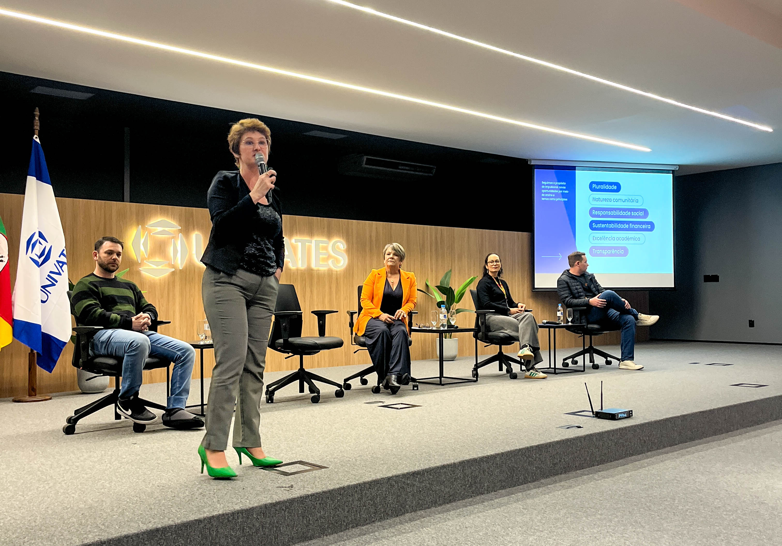 O painel contou com a participação da vice-reitora da Instituição, professora Cíntia Agostini; do gestor da Incubadora Tecnológica da Univates (Inovates) e vice-presidente da Rede Gaúcha de Ambientes de Inovação (Reginp), Michel Machado; da representante da Secretaria de Inovação, Ciência e Tecnologia do Estado do Rio Grande do Sul (Sict/RS), Emily Bittencourt; e do head do hub de inovação da Unimed VTRP - Vibee Unimed, Rafael Zanatta; e com a mediação da diretora do CEP, professora Grasiela Bublitz.