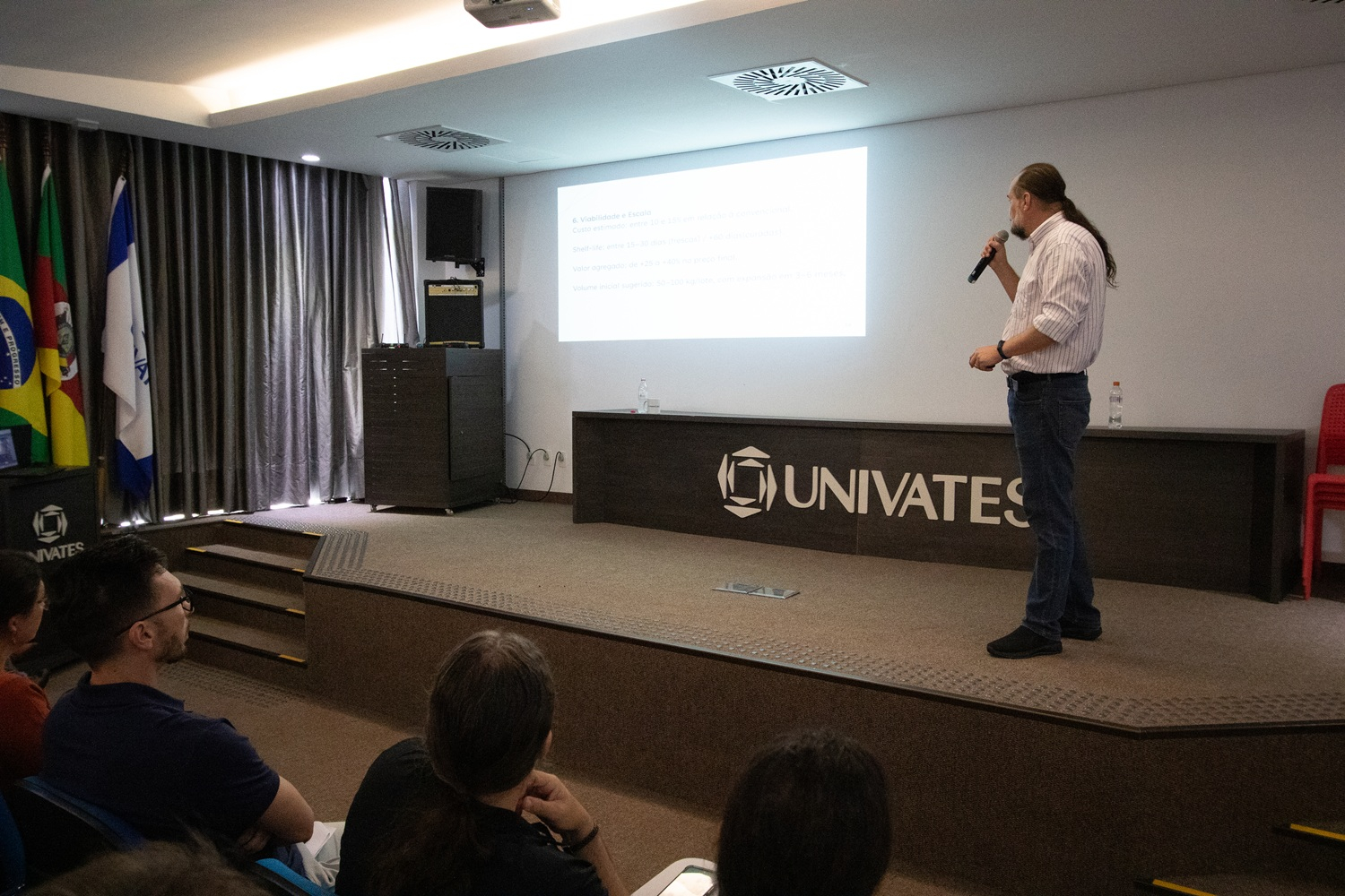 A programação iniciou com a palestra de Daniel Neutzling Lehn, professor da Univates e coordenador técnico do Centro Tecnológico de Pesquisa e Produção de Alimentos (CTPPA) Tecnovates, sobre “Inovação e Desenvolvimento de Produtos”.