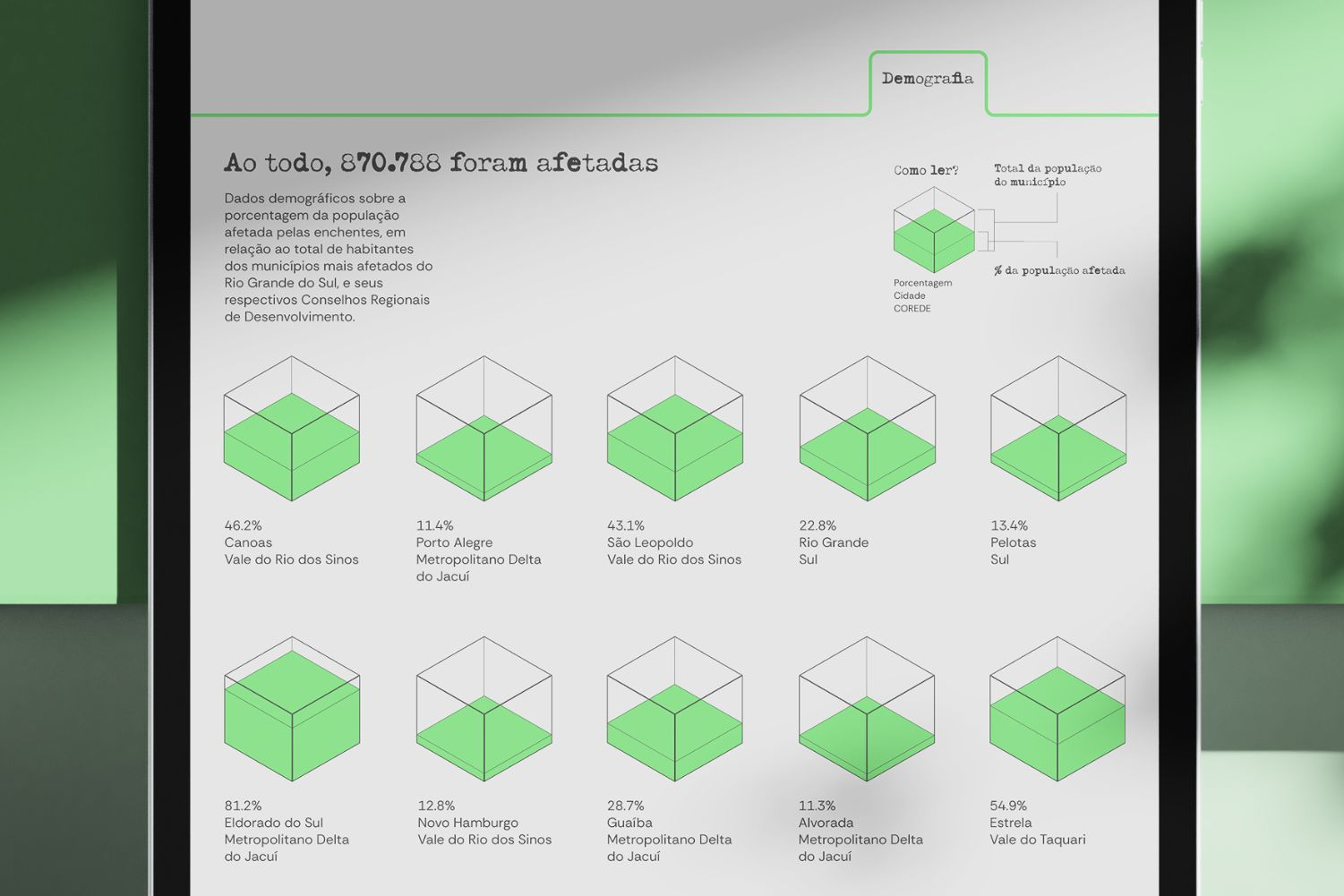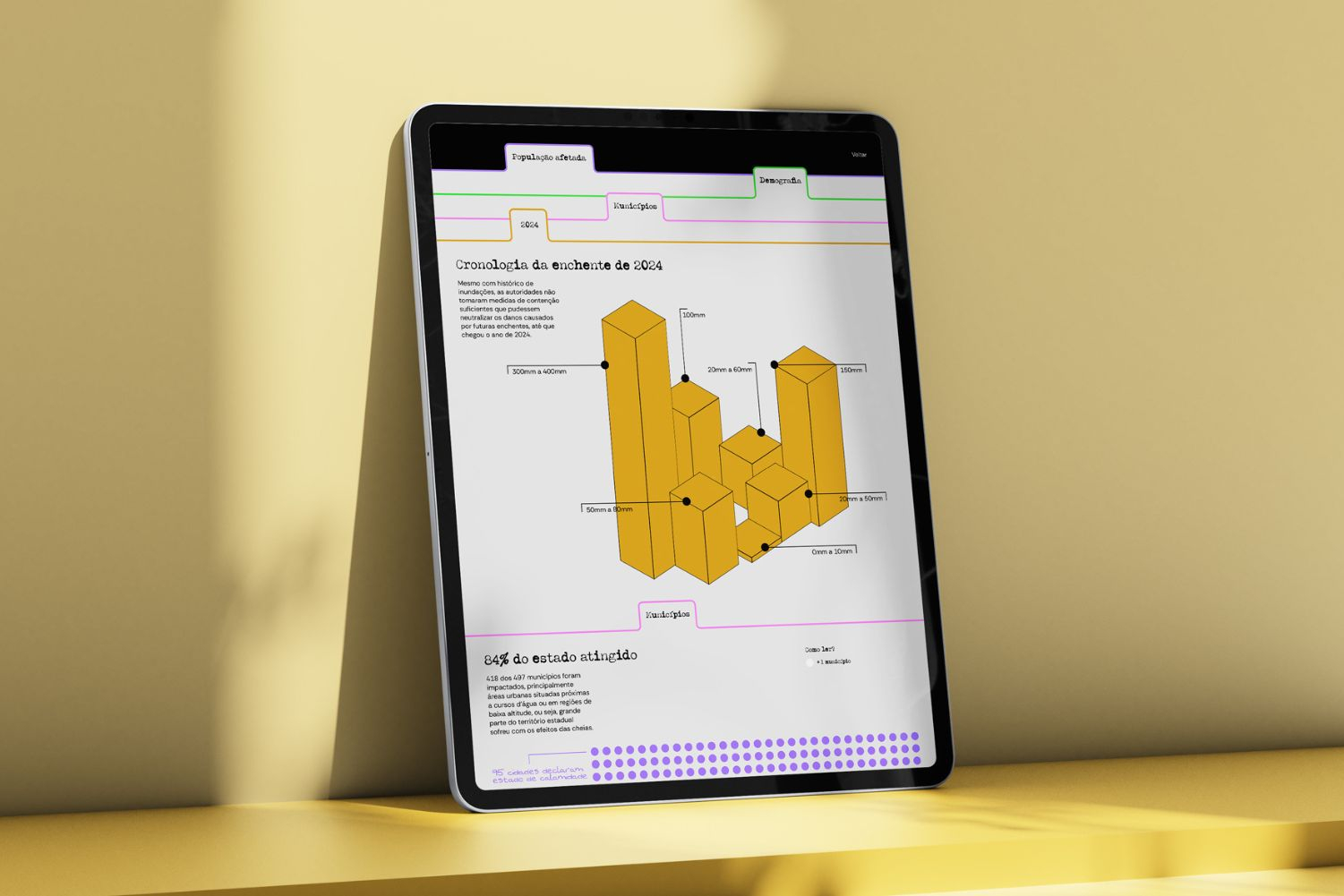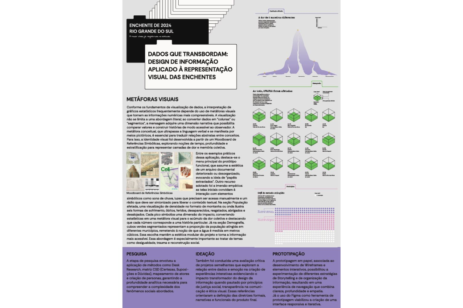 Já Marina desenvolveu um projeto sobre design de informação aplicado à representação visual das enchentes que ocorreram no Rio Grande do Sul, também documentado no memorial descritivo do trabalho. O projeto digital interativo, intitulado “Dados que transbordam: design de informação aplicado à representação visual das enchentes”, enfatiza narrativas visuais sensíveis, acessíveis e politicamente engajadas, buscando integrar visualização de dados, design de informação e comunicação de crise.