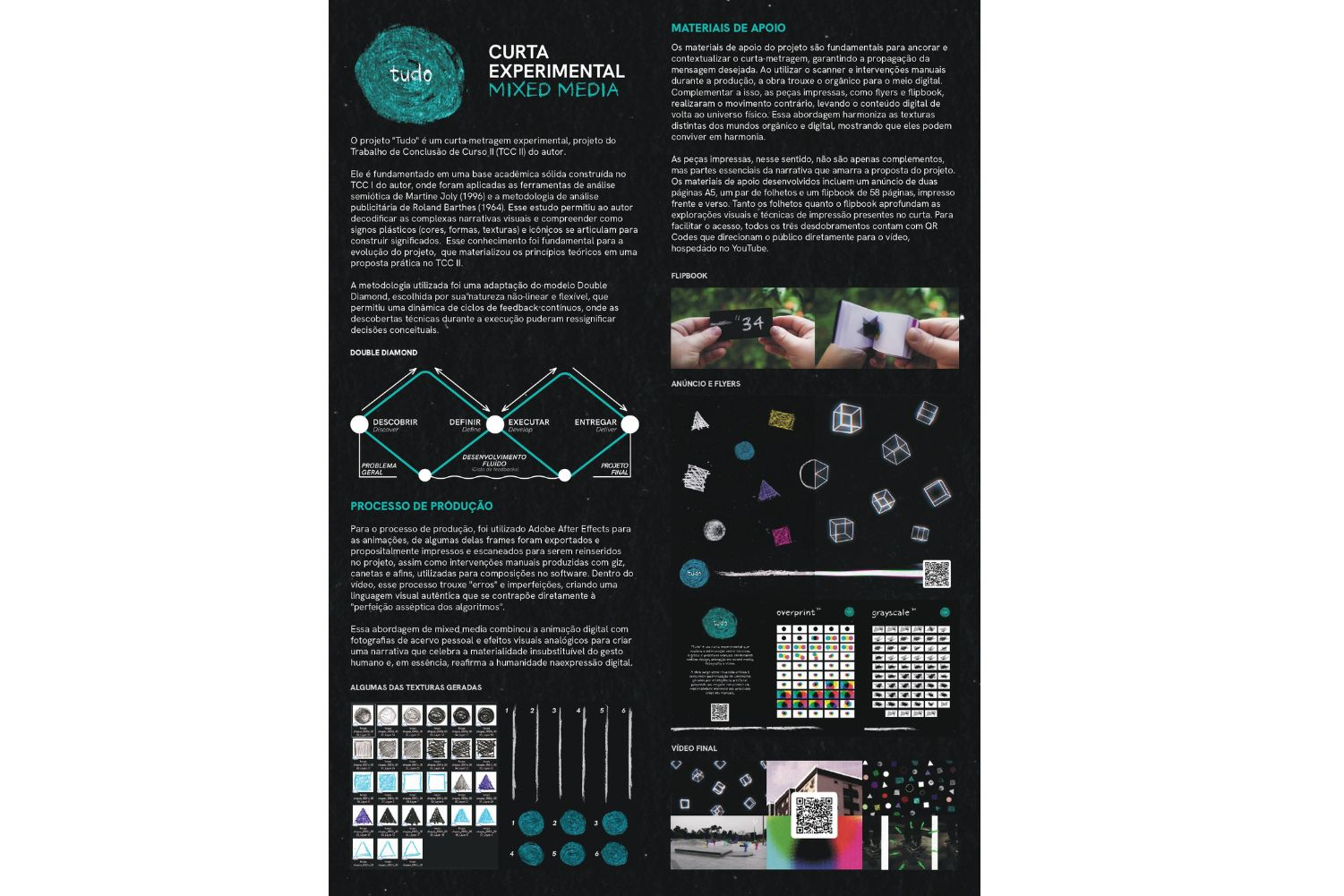 Para o processo de produção eu utilizei a abordagem mixed media, que consistiu na combinação de animação digital (motion design), fotografia, texturas manuais e digitais. A impressora foi minha ferramenta principal para a criação dessa estética: ela foi usada para digitalizar texturas manuais (produzidas por mim e meu irmão, Cassiano) e para a texturização de imagens digitais (quadros eram exportados, impressos e, posteriormente, escaneados e reinseridos). Como complemento a essa exploração, produzi folhetos e um flipbook, que aprofundam e contextualizam o conceito do vídeo.