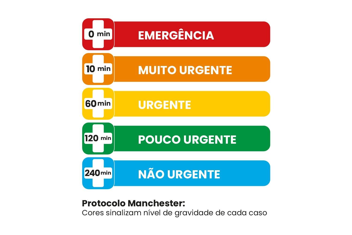 No Brasil, desde 2008, a classificação de risco mais comum segue o Protocolo de Manchester, com cinco cores para identificar os pacientes. Do vermelho, casos mais graves, ao azul, casos mais leves.
