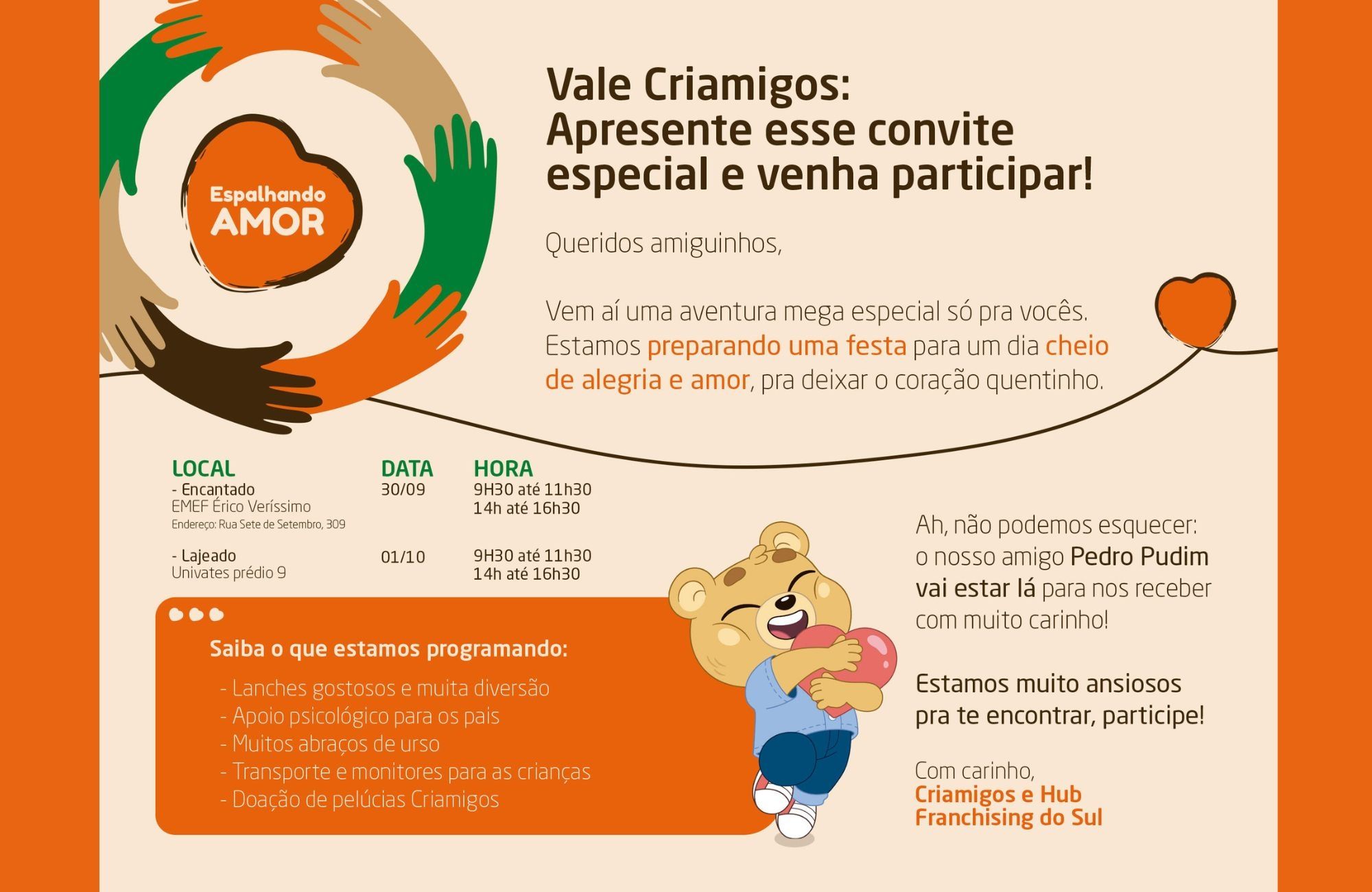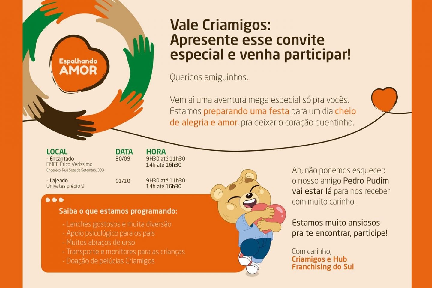 A Criamigos, rede de franquias de pelúcias personalizadas, e o Hub Franchising do Sul, grupo que conecta empreendedores que atuam no setor de franquias, realizarão uma ação especial para crianças e famílias que foram afetadas pelas enchentes no Vale do Taquari. No sábado, 30, as atividades acontecem em Encantado e, no domingo, no campus da Universidade do Vale do Taquari - Univates, em Lajeado.