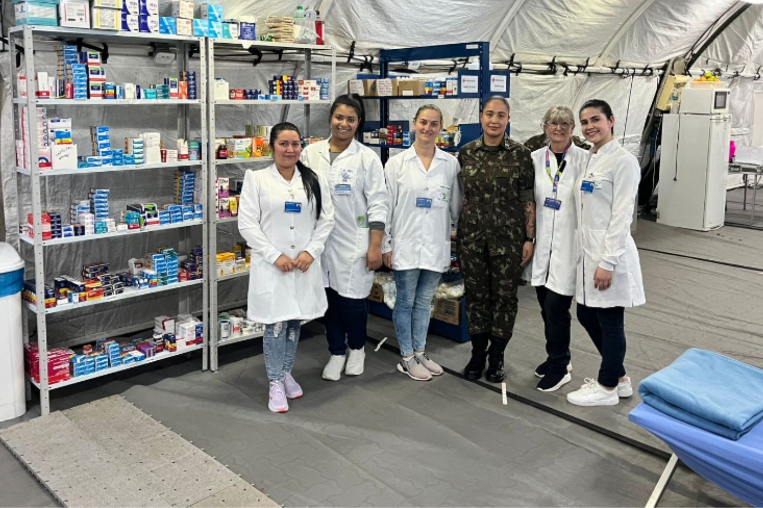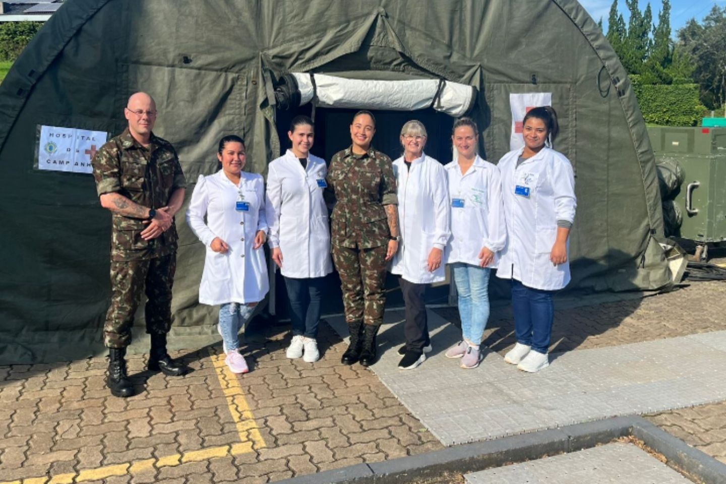 Na tarde de 22 de maio, um grupo de estagiários do curso Técnico em Enfermagem da Universidade do Vale do Taquari - Univates realizou visita ao hospital de campanha instalado junto ao SESI, em Estrela. Montado pelo Exército Brasileiro para atender às vítimas das cheias que assolaram o Vale do Taquari no início deste mês, o local tem sido importante na prestação de cuidados médicos emergenciais à população afetada pelas cheias e pelos deslizamentos na região.