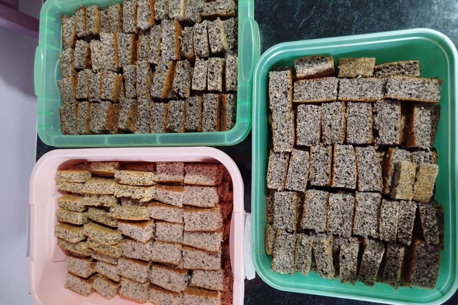 O preparo seguiu etapas tradicionais: mistura de ovos e açúcar, adição de manteiga e leite, e incorporação gradual das farinhas até formar uma massa homogênea. Os bolos foram assados em forno pré-aquecido a 180°C por cerca de 45 minutos.