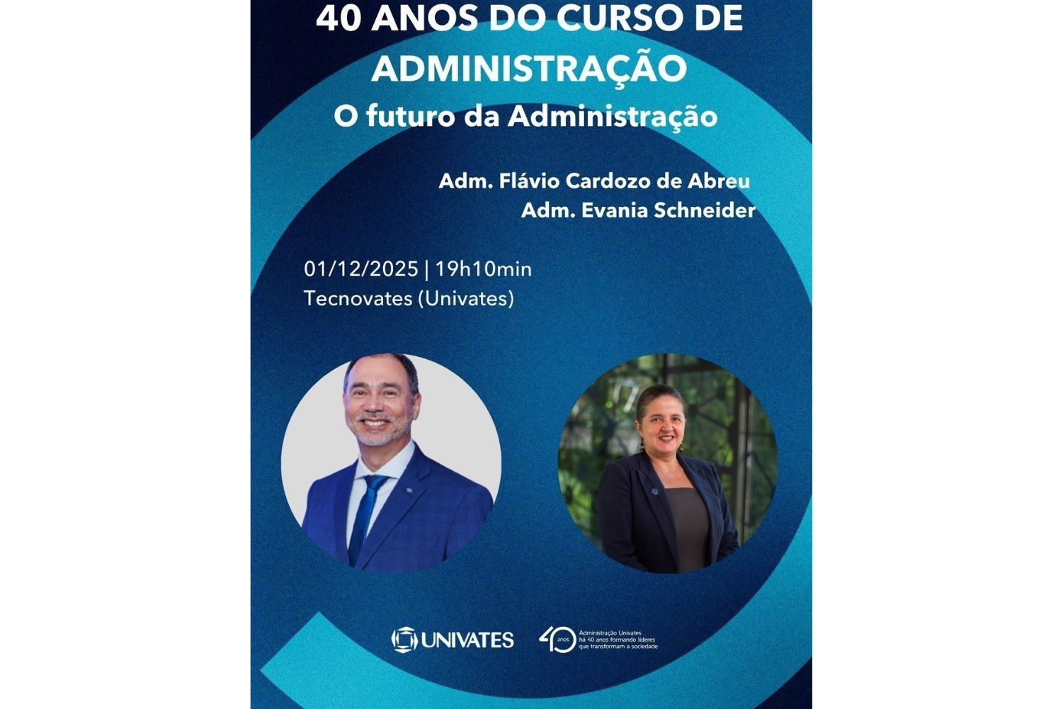 No dia 1º de dezembro, a partir das 19h10min, Flávio Cardozo de Abreu e Evania Schneider estarão no Tecnovates para realizar um painel temático em comemoração aos 40 anos do curso de Administração da Universidade do Vale do Taquari - Univates.