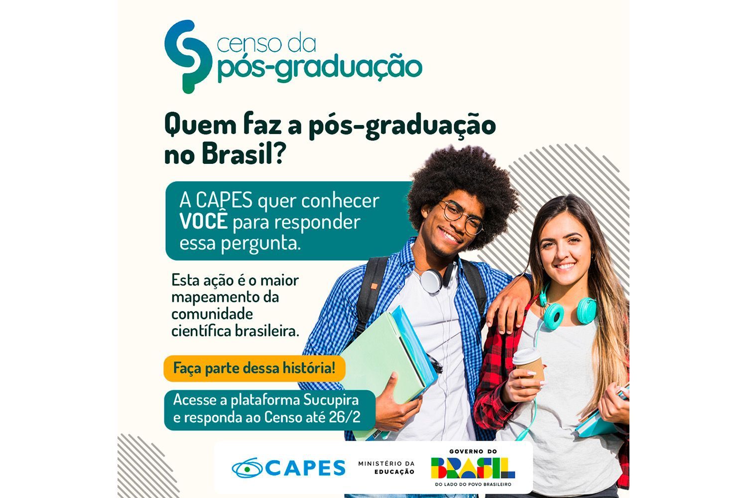 Docentes, mestrandos e doutorandos, pesquisadores em estágio pós-doutoral que não atuam como docentes e coordenadores dos PPGs devem participar. O preenchimento é realizado de forma individual e obrigatória, por meio de formulário eletrônico disponível na Plataforma Sucupira. A participação ocorre até o dia 26 de fevereiro.