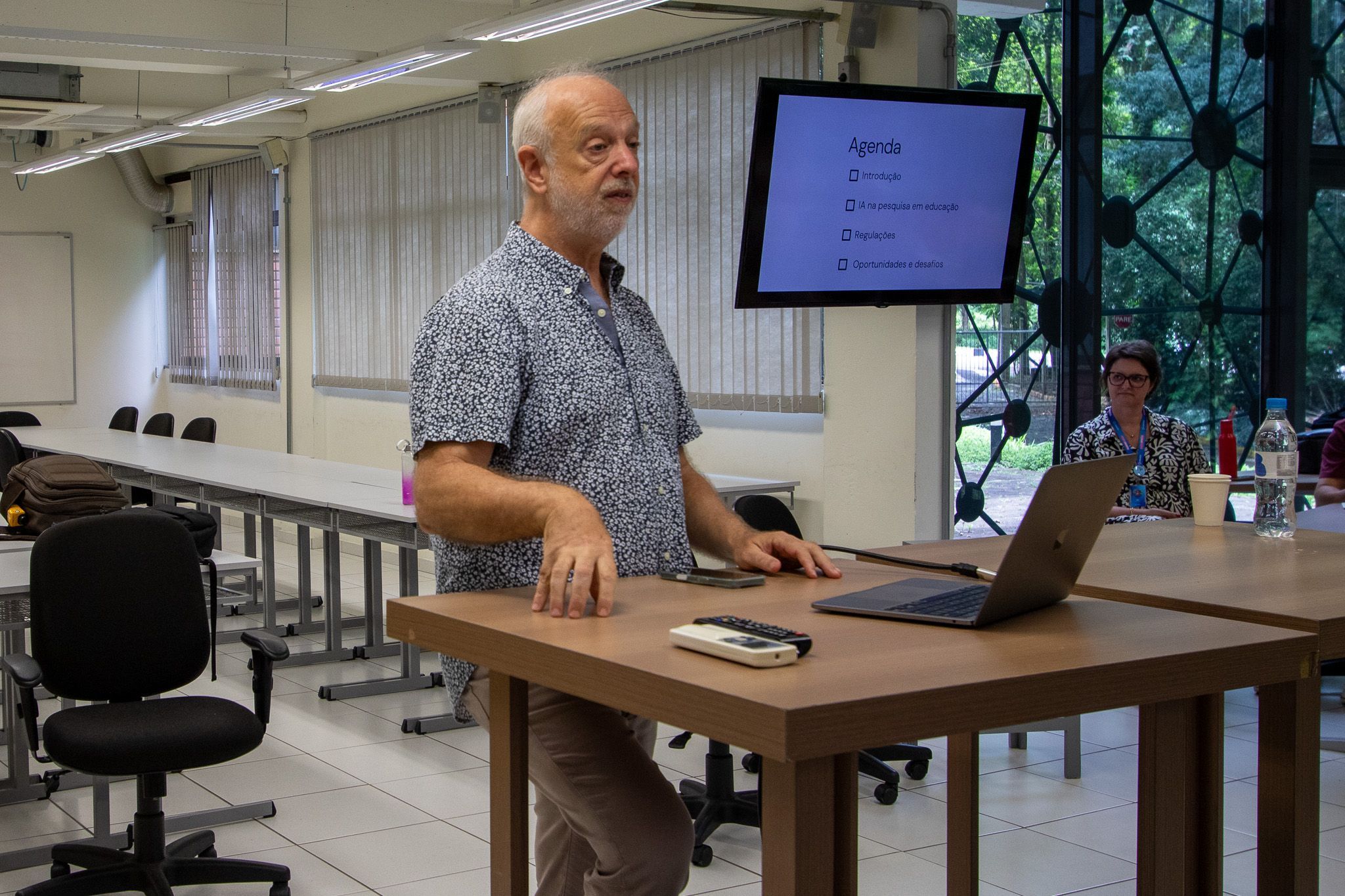 No segundo dia de trabalho, o professor tratou sobre publicações acadêmicas na era da Inteligência Artificial (IA), ferramentas, ética e estratégias para pesquisadores da área de Ensino. Fischman iniciou o minicurso falando sobre sua trajetória acadêmica e profissional, seus principais interesses de pesquisa e fez provocações aos participantes sobre o uso de IA e os desafios relacionados à área da educação.