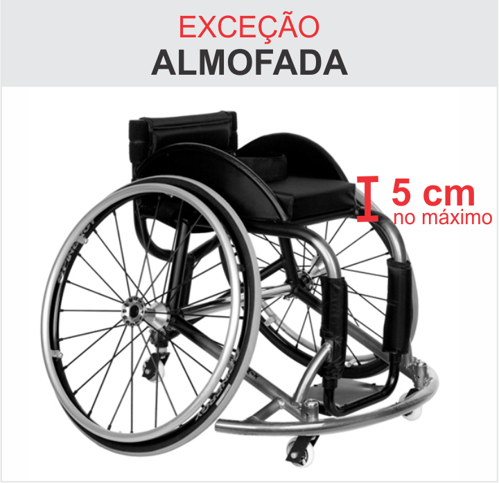 É PERMITIDA SOMENTE UMA ALMOFADA NO ACENTO DA CADEIRA DE RODAS, DEVENDO TER AS MESMAS DIMENSÕES DO ACENTO DA CADEIRA. A ALMOFADA NÃO PODERÁ TER MAIS QUE 10CM DE ESPESSURA. |