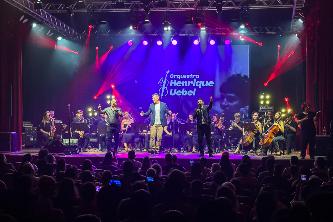 No palco, músicos da Orquestra Henrique Uebel dividem espaço com cantores convidados, em uma noite que valoriza a cultura popular brasileira e proporciona uma experiência musical única.