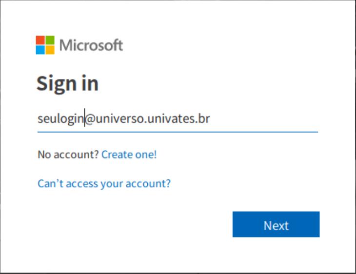Nessa etapa você deverá inserir seus dados acadêmicos, ou seja, seu e-mail institucional (seulogin@universo.univates.br), e em seguida sua senha.