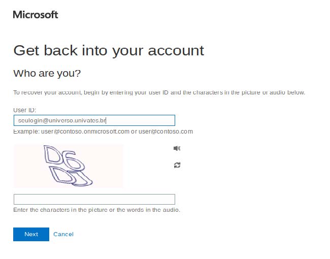 Na tela seguinte, no campo “User ID” informe seu e-mail institucional e digite os caracteres da imagem exibida e clique em “Next” para avançar.