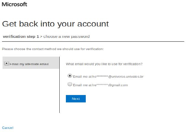 Selecione o campo que apresente seu e-mail institucional e clique em “Next” e em seguida você receberá um e-mail contendo um código de verificação para gerar sua senha no Microsoft Azure.